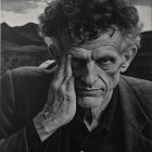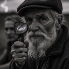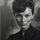 A glamorous woman in a stylish black dress and wide-brimmed hat adorned with colorful flowers, exudes elegance. Her red lips and pearl necklace complement her striking features.