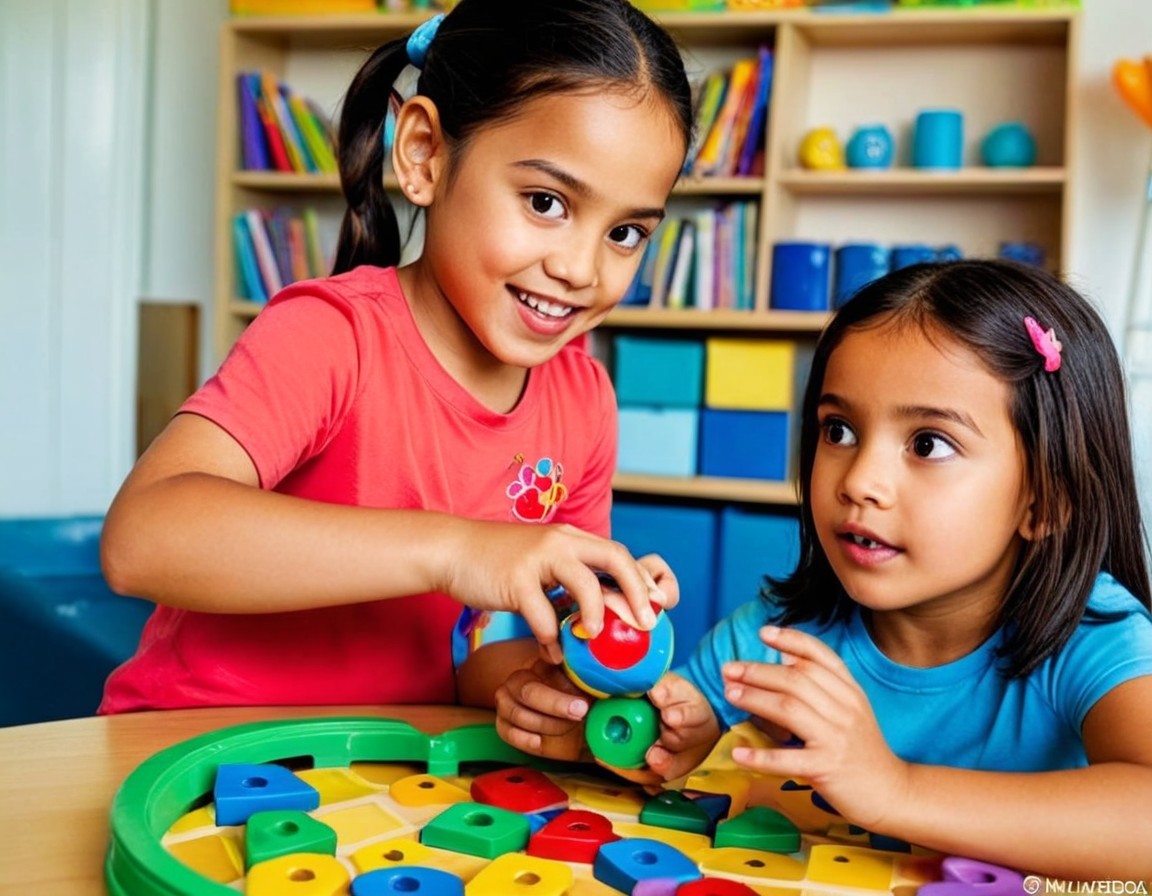 Two joyful children are playing together with colorful toys, smiling brightly against a vibrant backdrop filled with more toys. Their playful energy and friendship shine through.