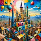 A vibrant, whimsical castle sits atop rolling hills, surrounded by colorful balloons and stars. The scene is illuminated by a bright moon, with a checkerboard path leading to the enchanting structure.