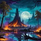 A dark, atmospheric landscape features a mystical castle atop a hill, surrounded by eerie, leafless trees and a glowing moon. Smoke rises from fiery patches, reflecting in a nearby waterway.