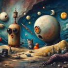A whimsical, surreal landscape features quirky, animated characters alongside planets and moons. Playful colors and imaginative forms create a dreamlike atmosphere filled with curiosity.