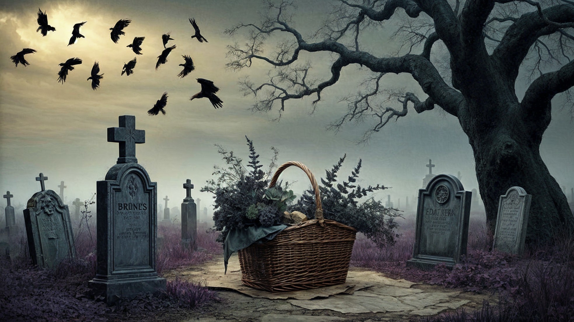 A mysterious graveyard under a full moon, with shadows of bats flying. A basket filled with purple fruit sits amidst tombstones, surrounded by eerie fog and gnarled trees, creating a haunting atmosphere.