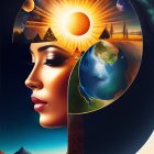 An artistic portrait of a woman's profile, featuring cosmic elements like planets, stars, and vibrant colors, seamlessly blending nature with the universe, creating a surreal and fantastical scene.