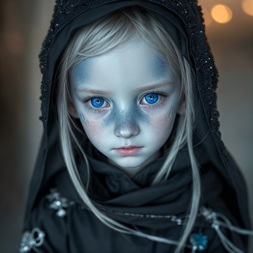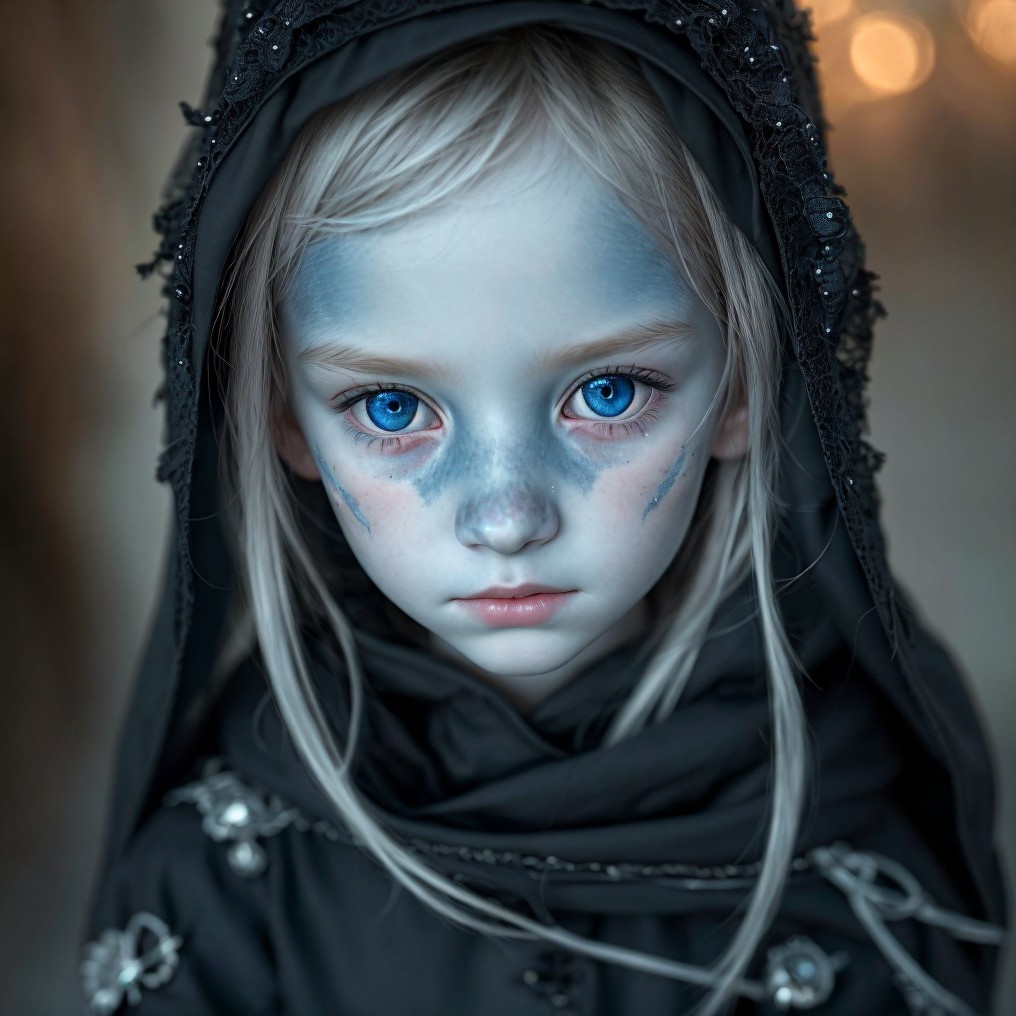 A young girl with striking blue eyes and pale skin wears a dark hooded cloak. Her face is adorned with intricate blue markings, giving her an ethereal and mysterious appearance.