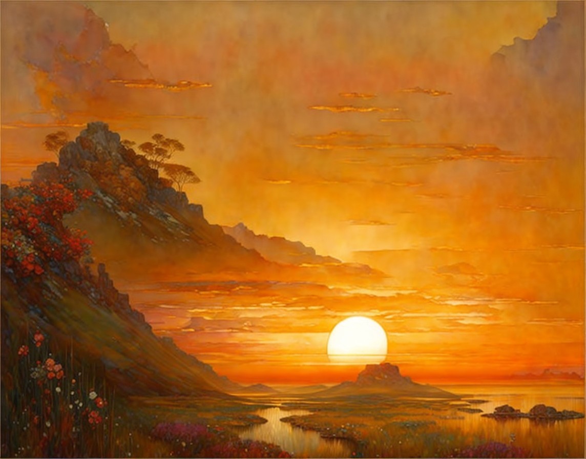 A serene landscape shows a vibrant sunset with golden hues, casting a warm glow over rolling mountains and a tranquil body of water. Silhouetted boats float gently amid the peaceful scene.