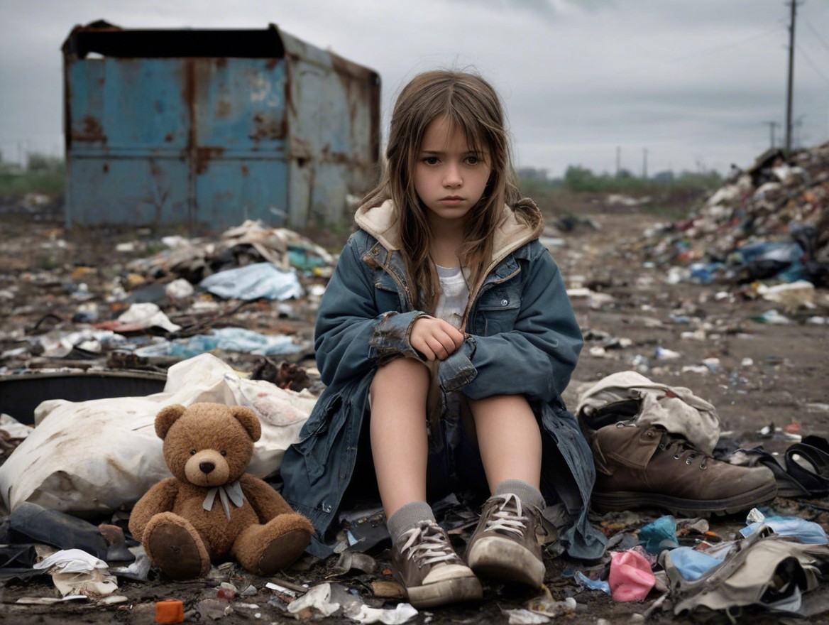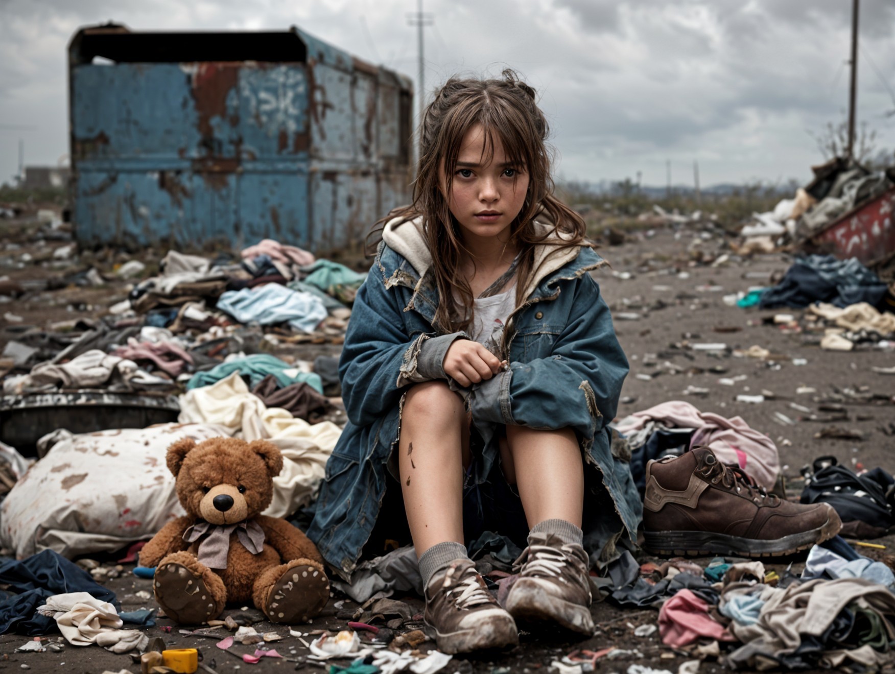 Prompt: "Tattered clothing, neglected young girl, old teddy bear, desolate atmosphere, garbage dump setting, somber mood, blurred background, overcast sky, scattered trash, rusty metal scraps, broken toys, stray animals, overgrown weeds, worn-out shoes, dusty environment, forlorn expression, soft natural lighting, muted color palette of grays, browns, and muted blues, emotional depth, realistic details, high-resolution digital art."