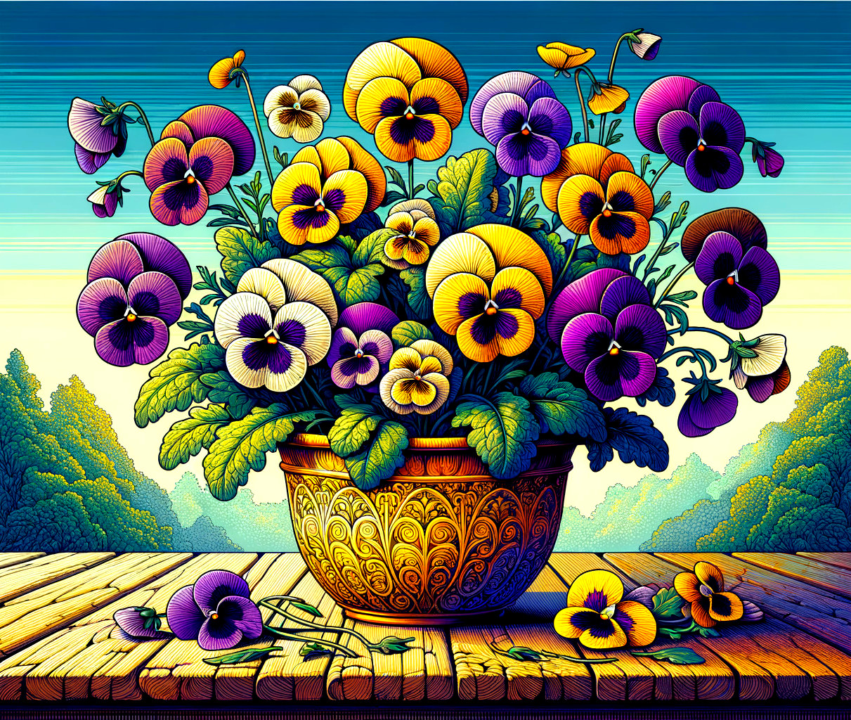 A vibrant digital artwork of a bouquet of colorful pansies in a decorative vase, with a stylized landscape in the background.