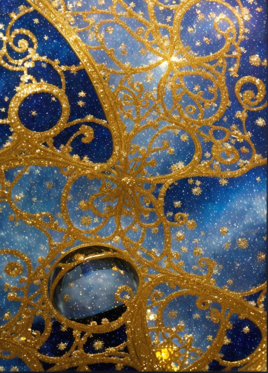 Celestial-themed art with gold filigree, galaxies, stars, and planets on deep blue background