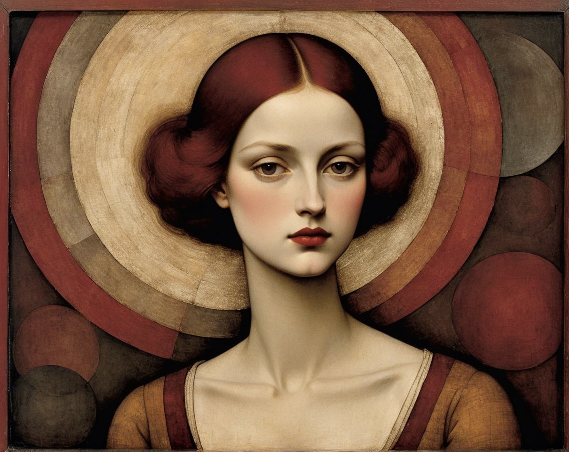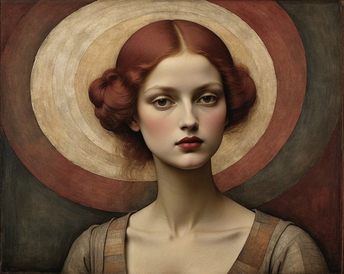 The image features a portrait of a young woman with long, wavy red hair and a serene expression, framed by a golden halo and a geometric background in warm tones.