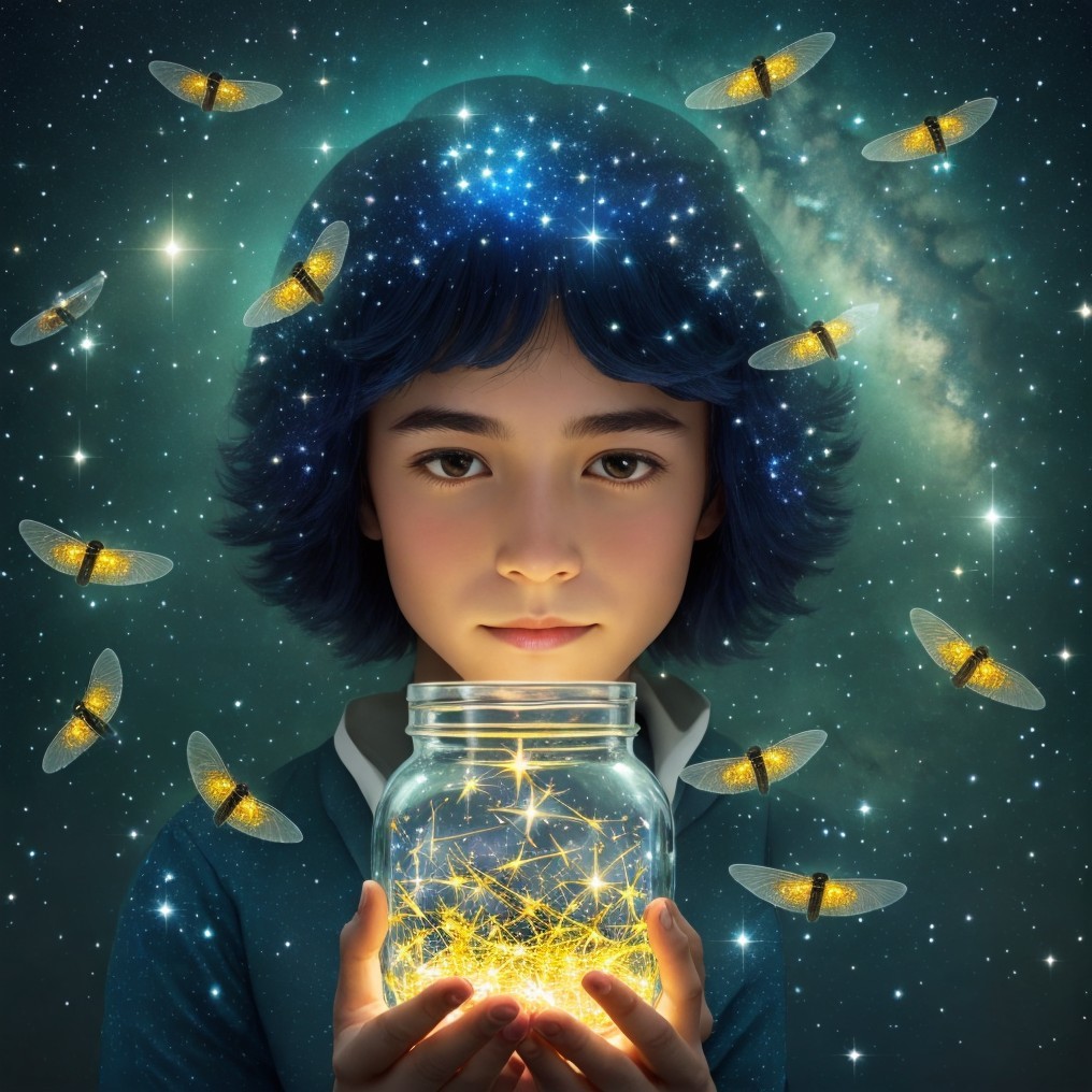 A child holds a jar of stars with a galaxy in their hair and glowing fireflies around; evoking a magical, dreamy feel.