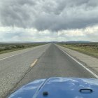 A man in a cowboy hat stands alone on a deserted road, surrounded by sparse vegetation and under a dramatic sky with scattered clouds and distant mountains.