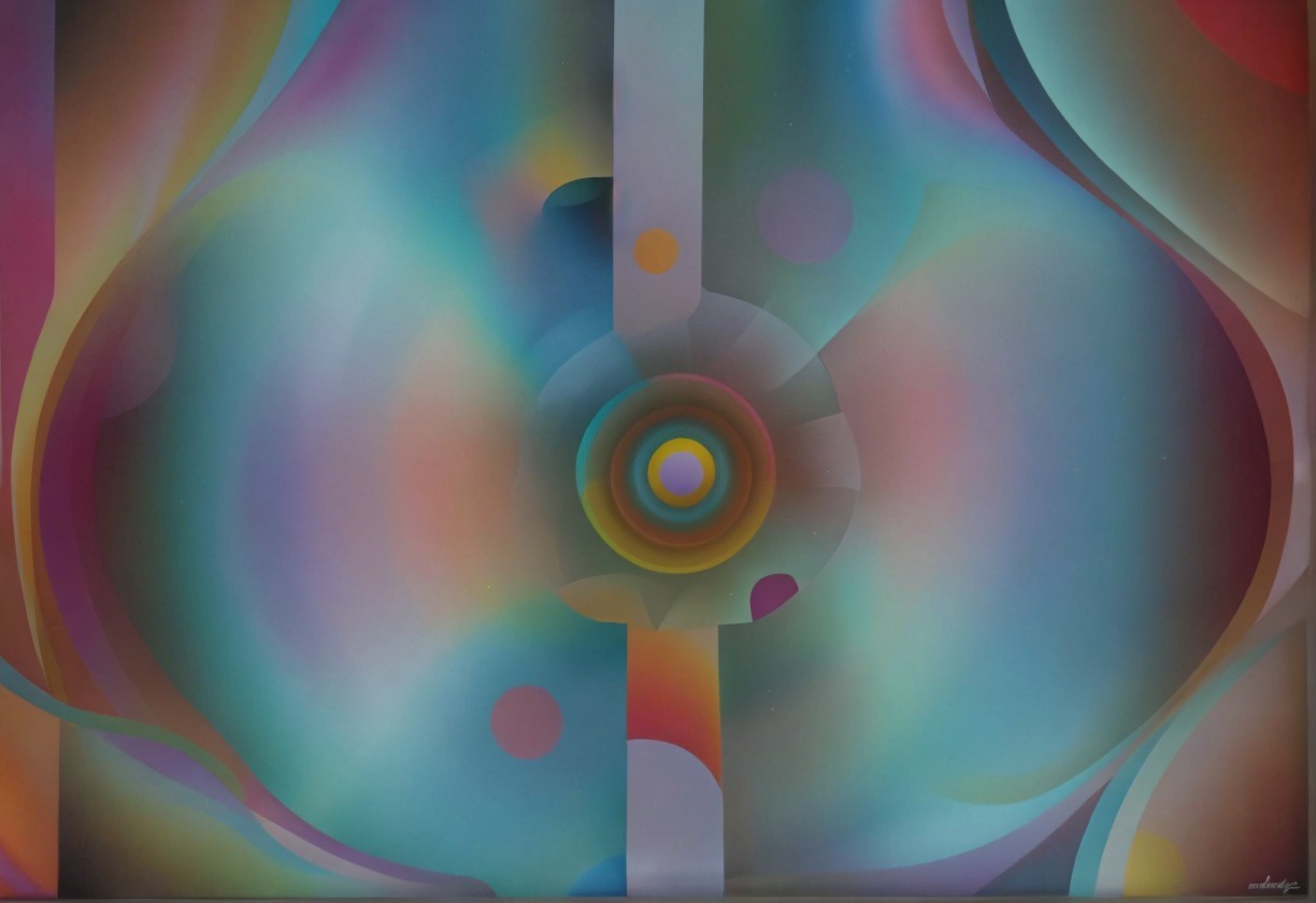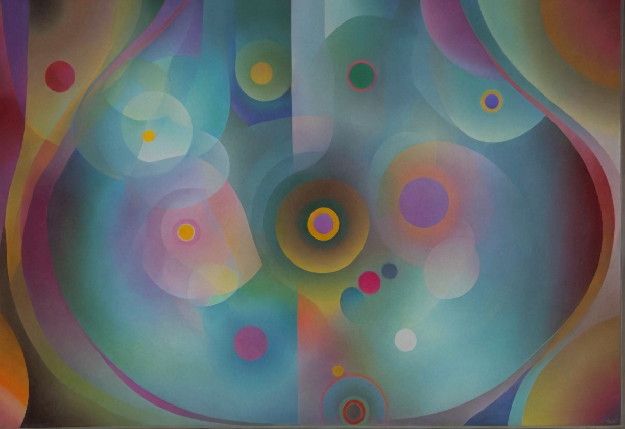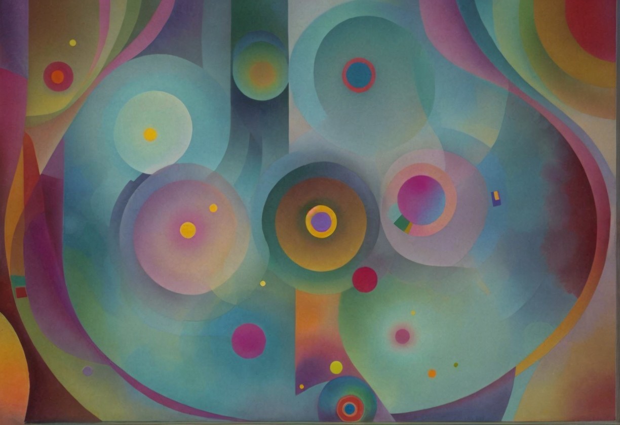 Abstract watercolor painting featuring vibrant swirls and dotted with multiple colorful circles against a warm-toned backdrop.