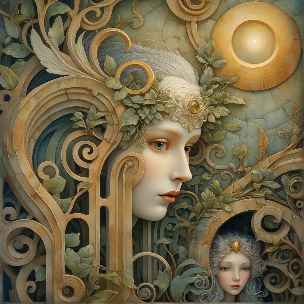 Close up, impish mischievous gorgeous white face creature with a staring into a portal in a luscious maze, in the style of Alexander Jansson. by Catrin Welz-Stein, Michael Parkes. By Rob Gonsalves, Markus Pierson. Bronze tones.