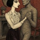 Stylish Woman Dances with Mummified Figure in Vintage Setting