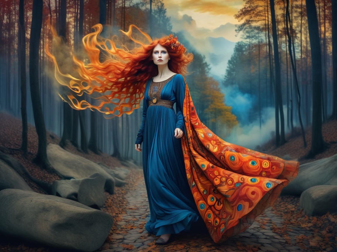 A fantastical figure in a flowing, colorful gown stands in a misty forest. Her vibrant red hair swirls around her, complemented by rich patterns and a magical aura that enhances the enchanting scene.
