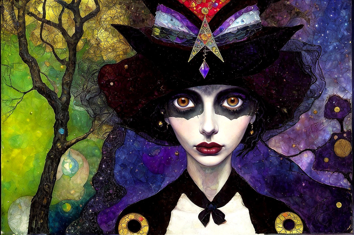 An artwork of a woman with a wide-brimmed hat, adorned with a colorful jewel, against a mosaic-style background with trees.