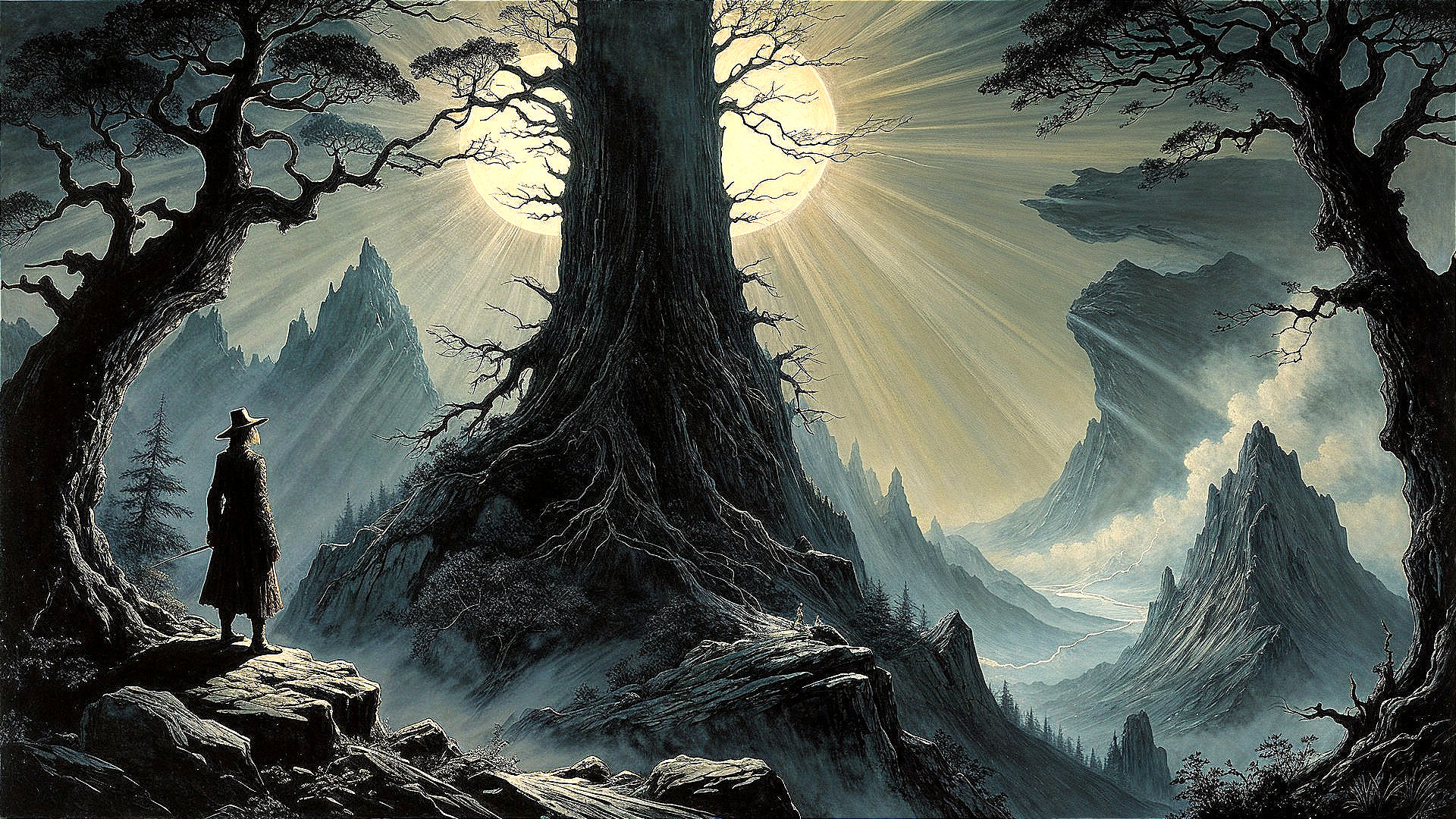 A mystical dark forest envelops a jagged mountain, where a figure stands before a luminous tree. This surreal scene blends impressionist techniques with vibrant colors, evoking awe and wonder.