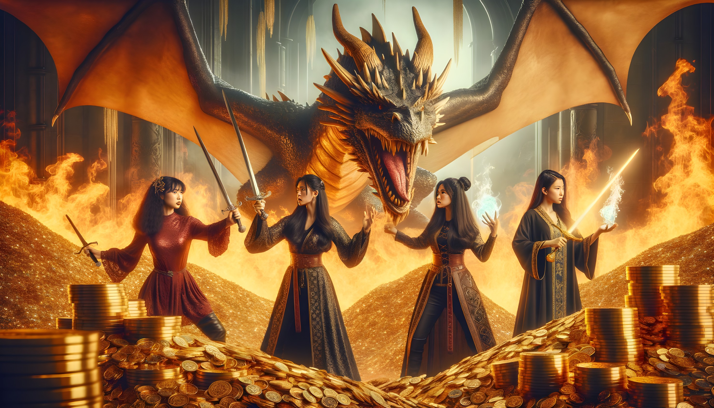 This was supposed to be 2 gorgeous Korean actresses dressed up in High Fantasy fighter clothing holding swords and 2 other gorgeous Korean actresses dressed up as high fantasy magician spell casters. They are supposed to be battling against Smaug the giant fire breathing dragon from Tolkien's Lord of the Rings movies. The dragon's lair has tons of gold coins everywhere. It doesn't even look like they're battling Smaug. They seem to be self-absorbed with themselves. LOL! Well, I guess they'll get burnt by Smaug's fire breath and get eaten if they don't look behind them.