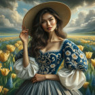 Masterpiece, a delicate ink and watercolor wash rendering on rough handmade paper. A vibrant and surreal scene unfolds, executed in the spirit of a multi-block color woodcut. The composition is anchored by a key block of deep, solid black ink lines, which carve out powerful, graphic forms against a rich, flat field of deep jade green. On the left, a slender young woman stands with confident posture. Her medium brown skin is rendered as a smooth, inked plane, while her intricate jewelry and form-fitting blue skirt are detailed with precise, blueprint-like patterns and Egyptian-inspired motifs, all defined by the key block’s sharp lines. A majestic golden lioness stands beside her, its fur textured with fine hatching and bold symbolic patterns, rendered in warm ochre and amber washes. On the right, a regal woman with striking, solid blue skin holds a luminous orange fruit. Her elaborate dress and tall crown are a complex interplay of positive and negative space, filled with intricate golden Kintsugi patterns and an oxidized copper patina, achieved through layered metallic inks and muted green accents. In the foreground, a relaxed striped cat is outlined in clean, bold strokes, its form simple yet expressive. Circular sun motifs, stark and ornamental, are carved directly into the design, printed in flat oranges, yellows, and olives. The entire composition is unified by a dotted teal background texture, achieved through meticulous stippling. The style is a retro-psychedelic fusion graphic, high-contrast, and richly layered, where every element is defined by the unifying power of the black key block. surreal, graphic, intricate, vibrant, elegant, award-winning, ultra-detailed, high definition, crisp quality, watercolor, ink, rich colors, graceful, screen-filling, atmospheric.