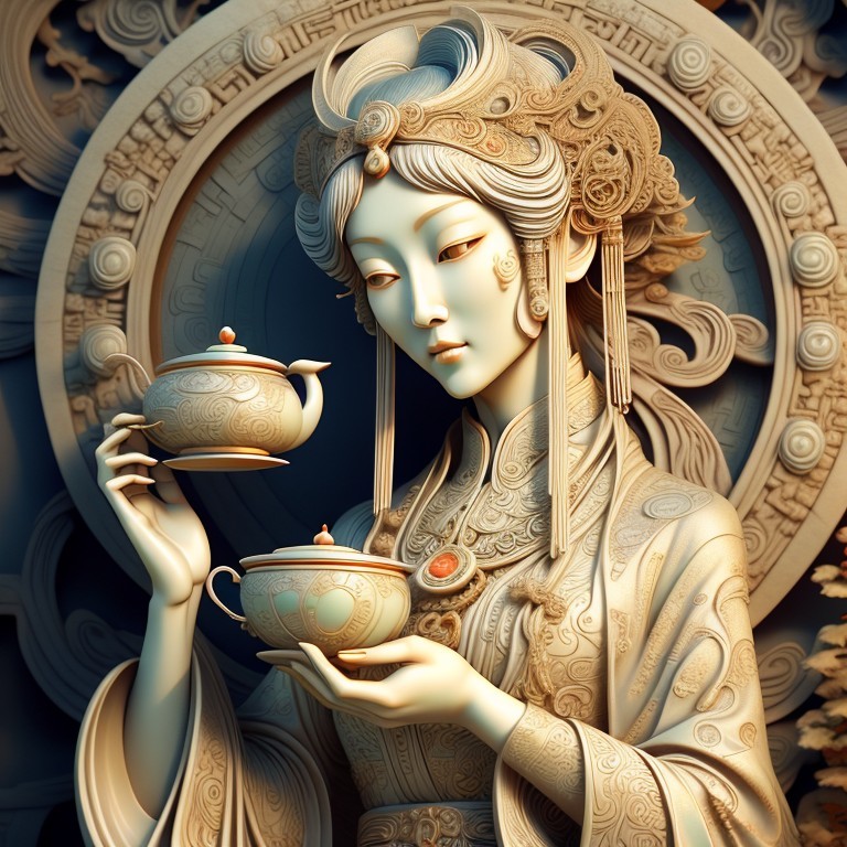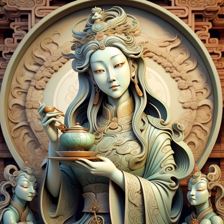 A colorful, stylized illustration of a deity with ornate jewels and attire, holding a vase, against an intricate circular backdrop.