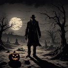 A shadowy figure stands on a deserted path, silhouetted against a full moon. Nearby, a carved pumpkin glows ominously, with a spooky mansion looming in the background amidst barren trees.