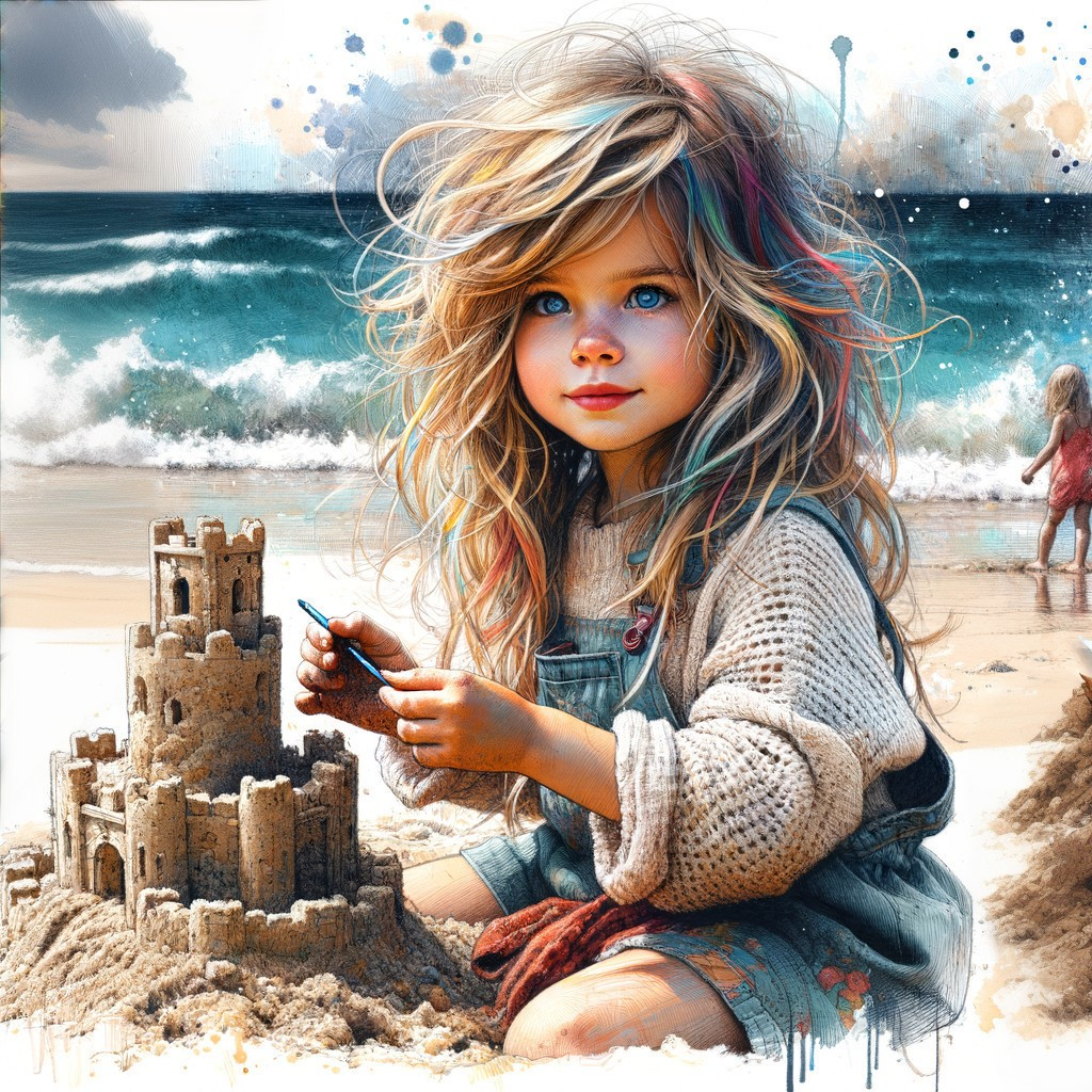 A young girl with wavy blonde hair plays in the sand at the beach, building a sandcastle, with vivid blue eyes and ocean backdrop.