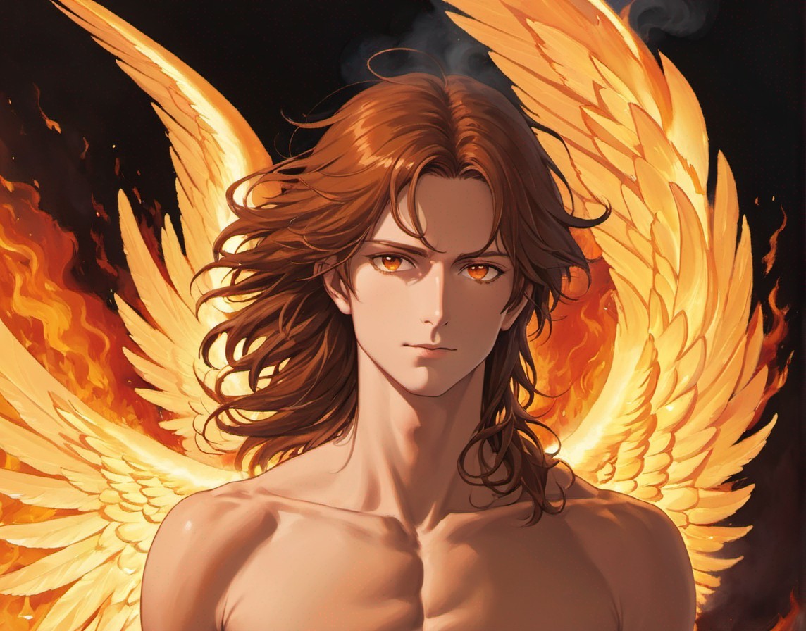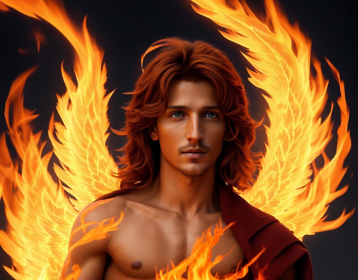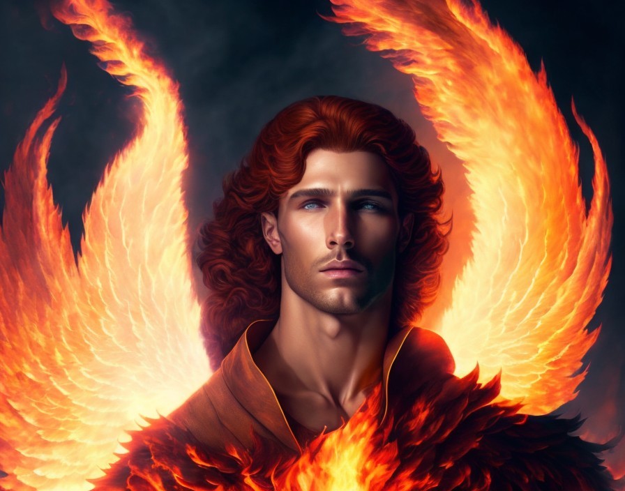 This image is of a man who is an angel. He is a feuerengel. A tall thin German man in the form of an angel. He has reddish brown hair and orange, firey eyes. The angel emerges from flames. There is fire in the background."