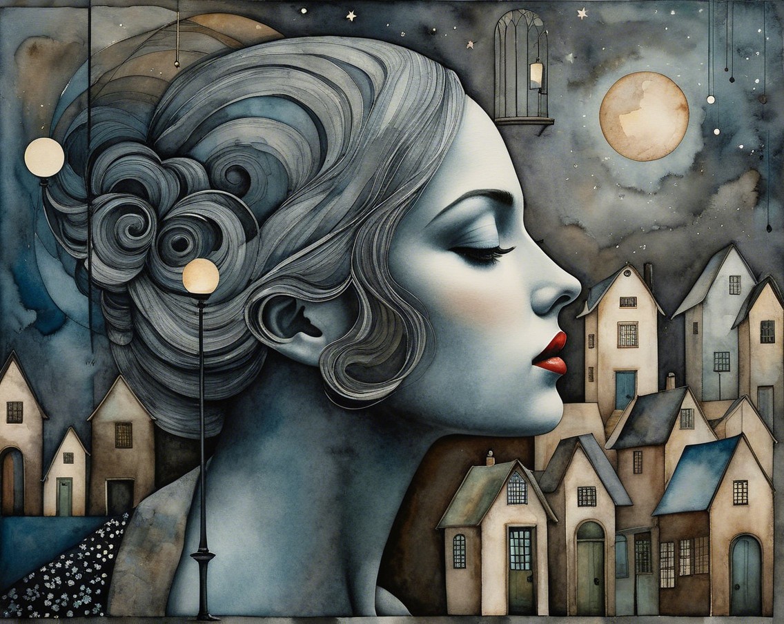 The artwork features a profile of a woman with a serene expression, adorned with intricate geometric patterns in blue, gold, and metallic tones, creating a captivating and modern aesthetic.