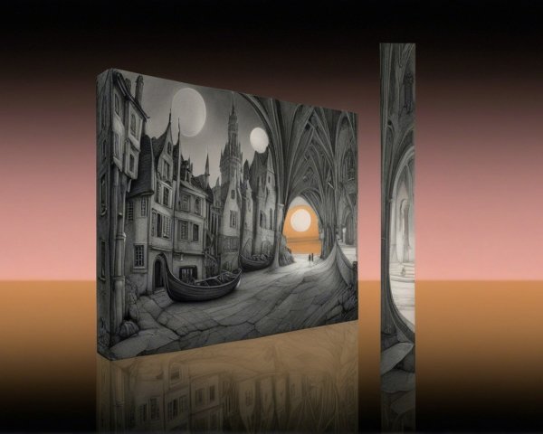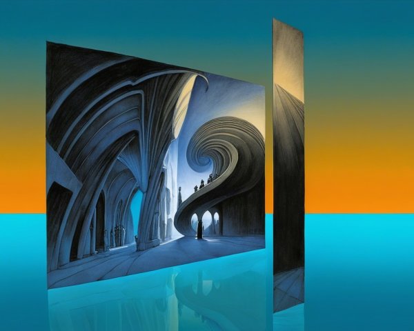 A serene landscape featuring two towering trees with vibrant golden foliage, reflecting in a tranquil lake. Behind them, snow-capped mountains rise under a blue sky dotted with clouds.
