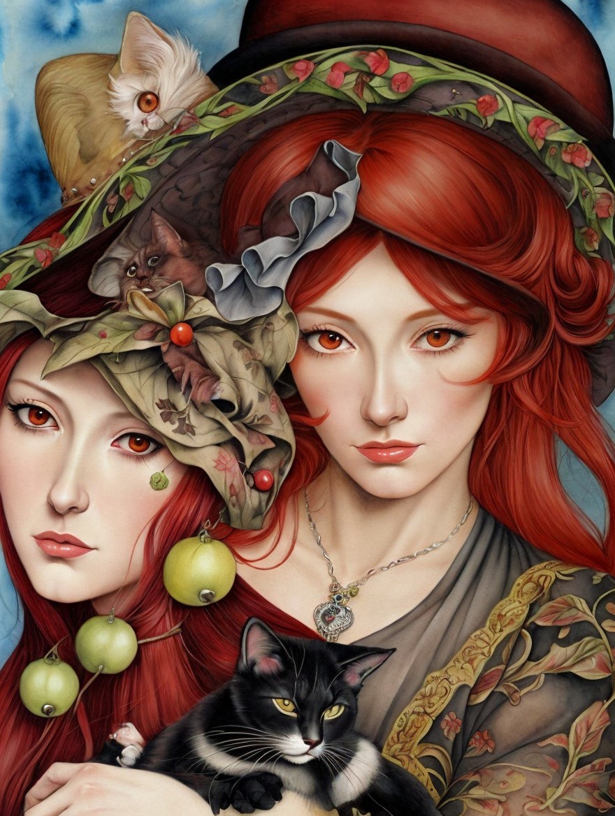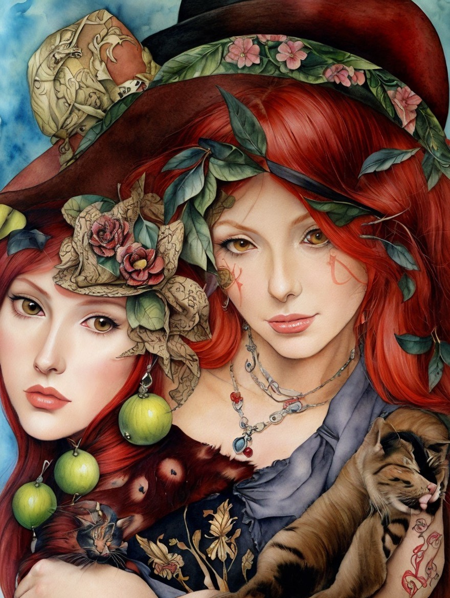 Illustrated Portrait of Two Red-Haired Women with Hats