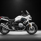 A sleek, silver motorcycle stands against a dark backdrop, illuminated by soft lighting. Its sporty design features an aerodynamic frame, a prominent exhaust, and rugged tires, exuding a sense of adventure.