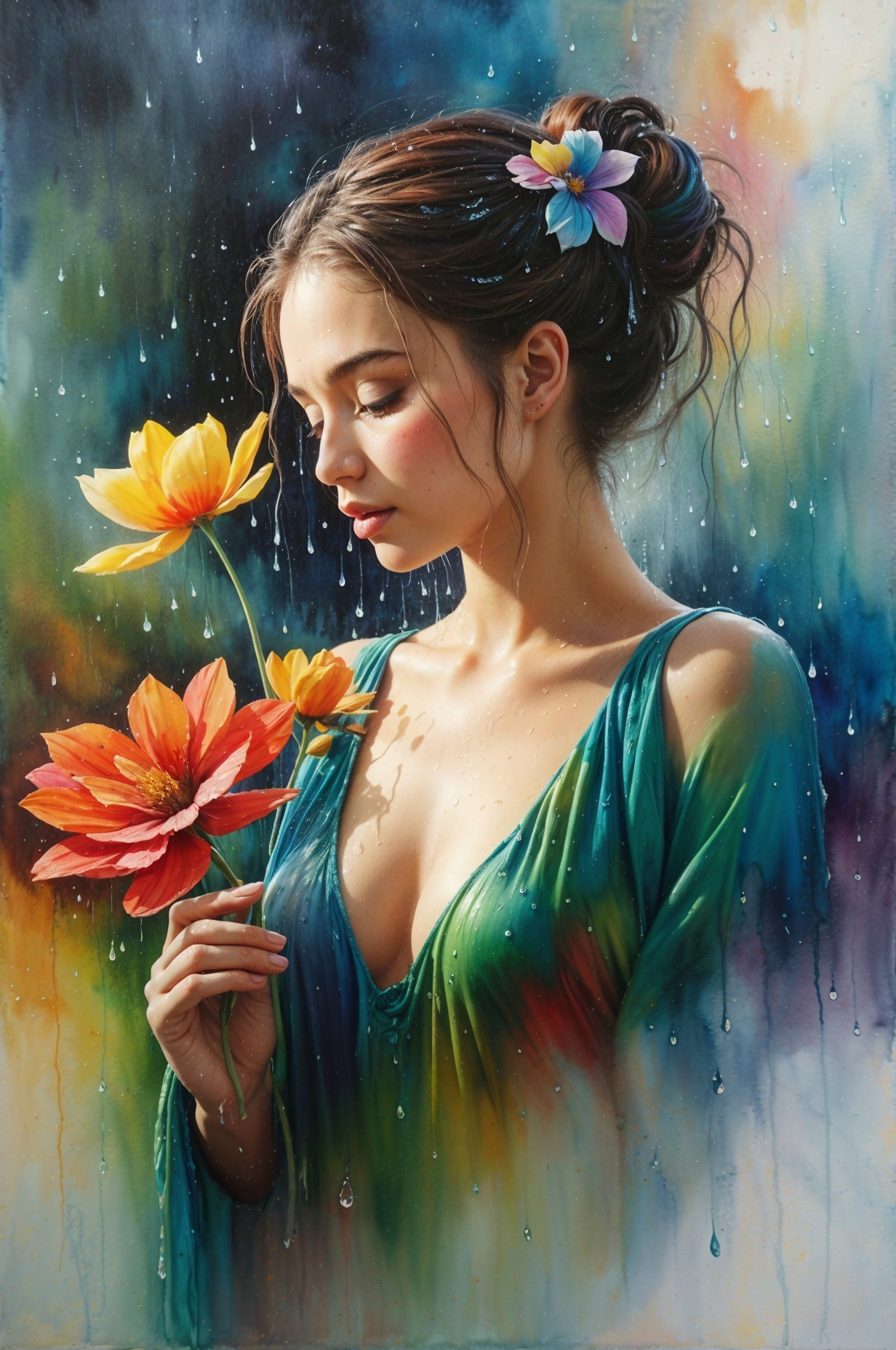 A colourful painting of a woman with a calm, relaxed expression, holding orange flowers. Coloured raindrops cascade around her, adding a dreamy atmosphere to the lively backdrop.
