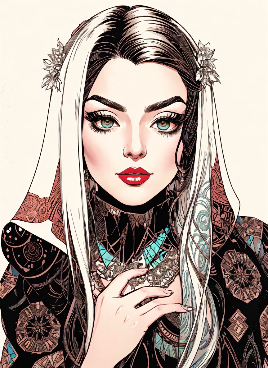 Stylized woodblock print of a portrait, a wicked enchantress with crystallinelong hair, long eyelashes, detailedcrackles, grungy garment, stylized marvel comics art, style of Georgia O'Keefe, Overton Loyd, Alexander Archipenko, geof darrow, Andrew Atroshenko, Zio Ziegler, stylized curly hairstyle, perfect handsface, divisionism, synthetic, spiritual, american gothic 1.3, auracore, anglo gothic 1.2, octane render illustration, juvenile, hues ,gothical, grain, serene, somber, sore, Schreger ines 1.3, octane render illustration, anisotropic filtering 1.2, dynamic lighting 1.1, colored zentangle drawing, style is reminiscent of movie poster art, raytraced shadows, dethereal, abstract, coherent, fauvistic, ambient occlusion 1.5, shadow mapping 1.3, line-art, simplistic texture patchwork 1.8,, soft pastel coloring, , lineage art, sgraffitto style, background in triadic color scheme beige grey auburn, poster art, stylized illustration 1.5, subtle coloring, artistic ,synthetic, modern, abstract, chic.,traumacore 1.9, style of 1970s advertising art, delicate coloring, pointillism details, close-up, woodblock print, colored line drawing, style of comic book art, tiny lines, pastel colors of Auburn and brown, dynamic dramatic lighting from top, dreamscape, traumacore 1.9, concept art, mystery essence, perfect handsface, cel-shaded illustration, kinetic, colored line drawing, simplistic, beautiful composition by Georgia O'Keefe,