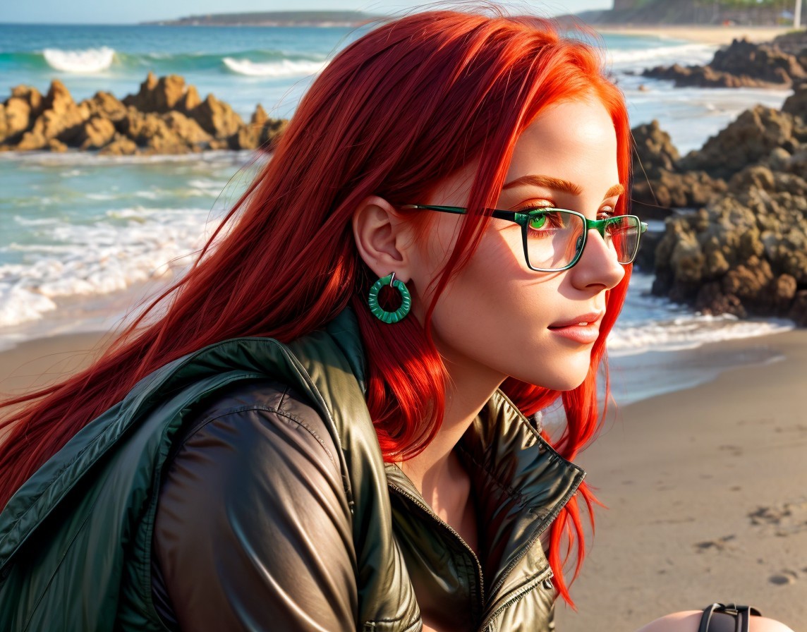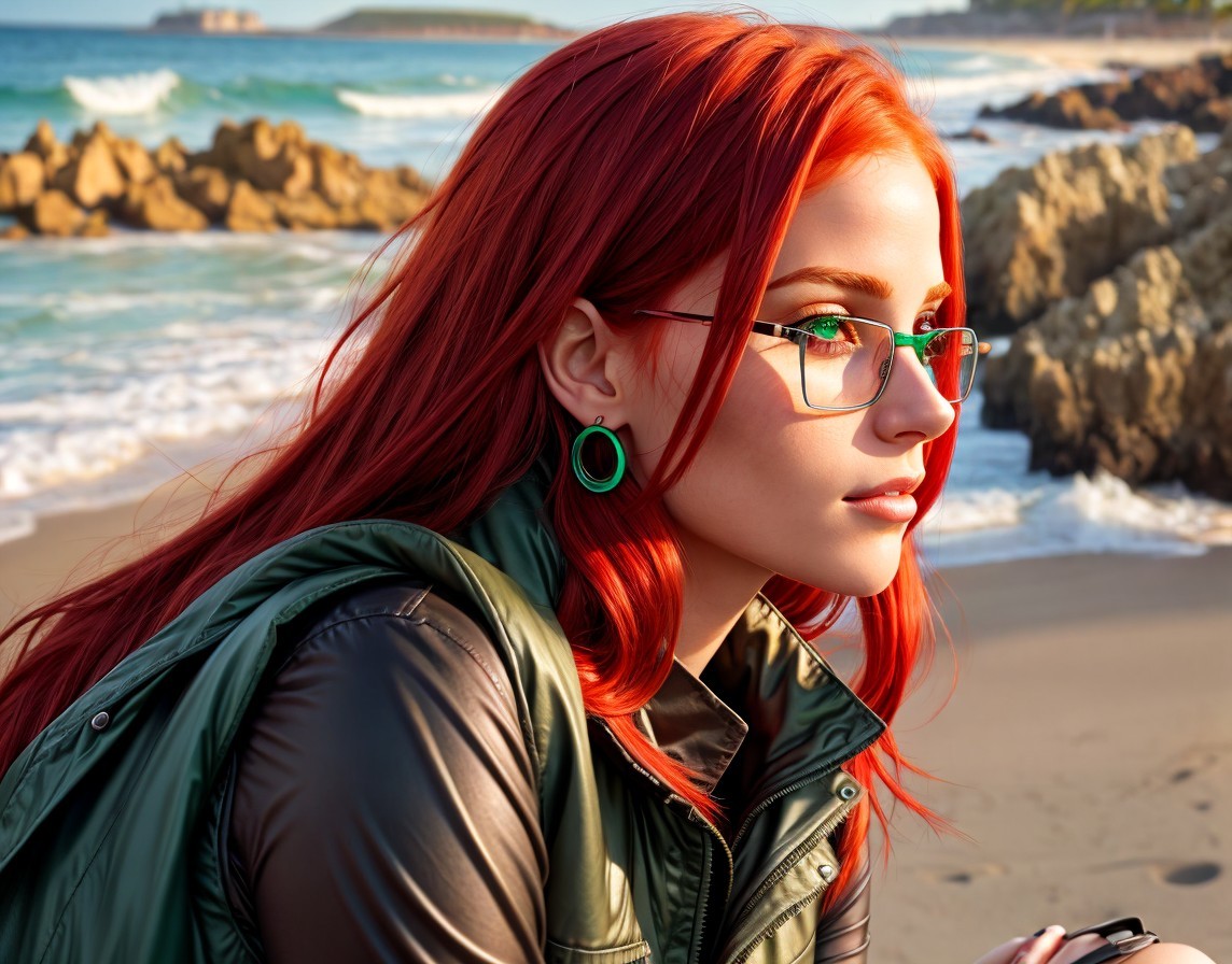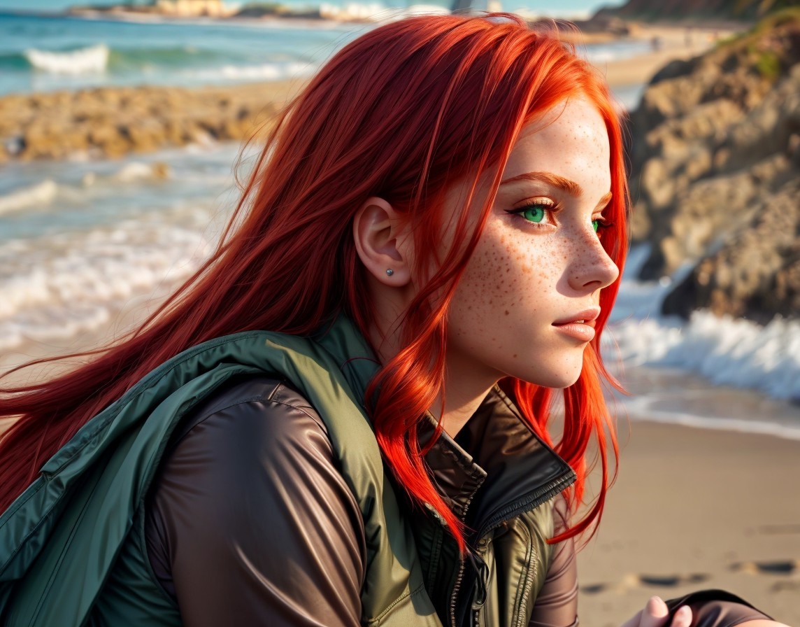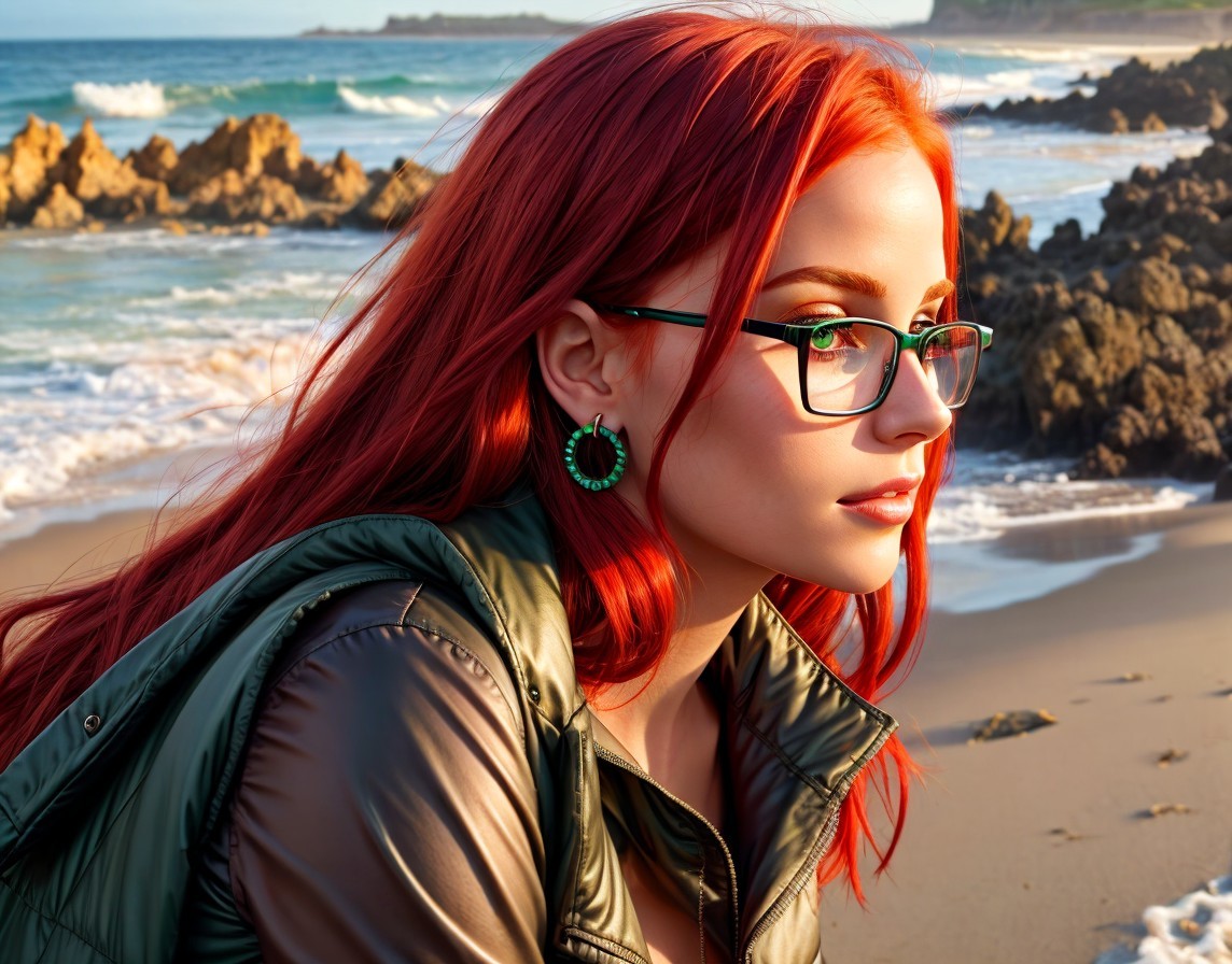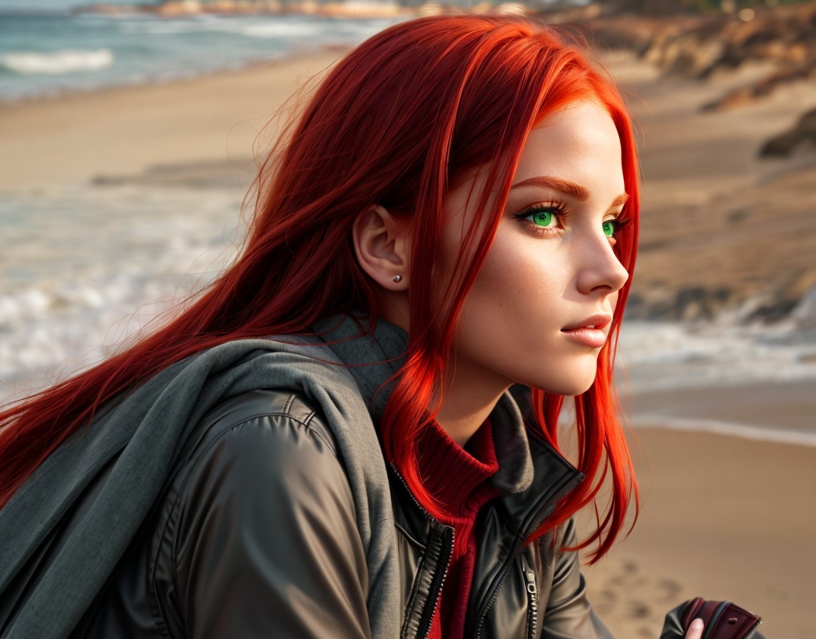 Digital Artwork of Woman with Red Hair at Sunset Beach