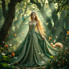 A mystical forest scene features a graceful fairy queen in a flowing green gown adorned with intricate details. Surrounded by butterflies and flowers, she exudes ethereal beauty, with a curious fox nearby.