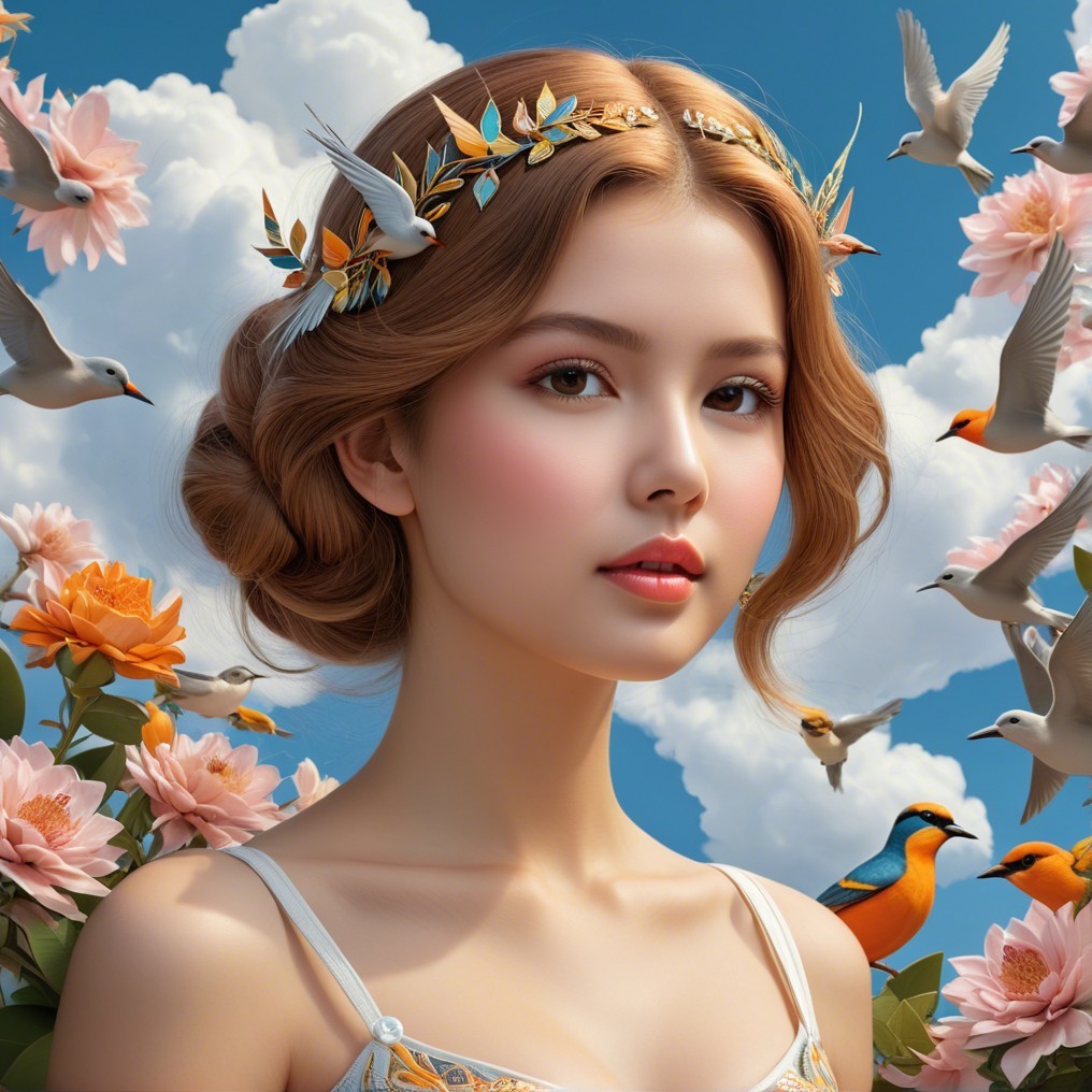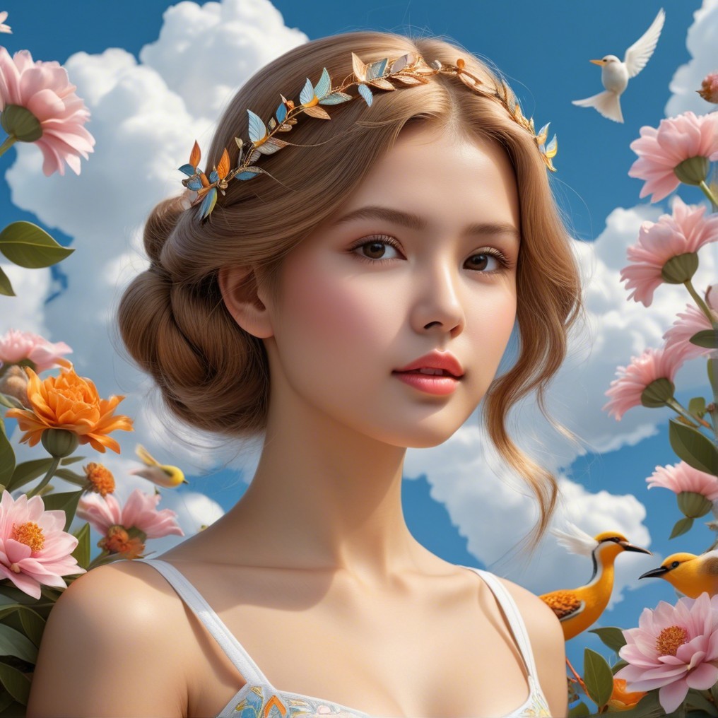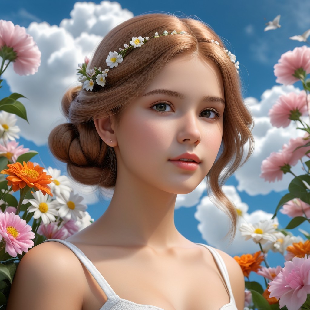 A young woman with soft features and a floral crown gazes serenely. Her warm skin tone complements the vibrant flowers surrounding her, set against a bright, sunny landscape.