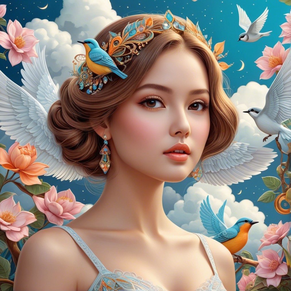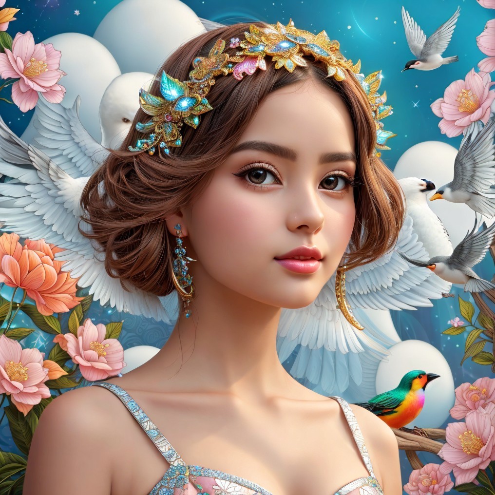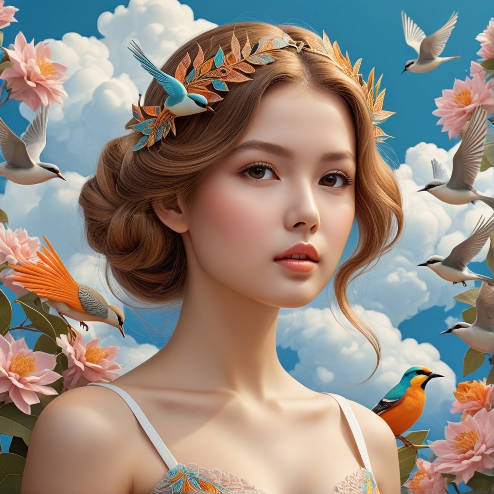 A young woman with soft features and a floral crown gazes serenely. Her warm skin tone complements the vibrant flowers surrounding her, set against a bright, sunny landscape.