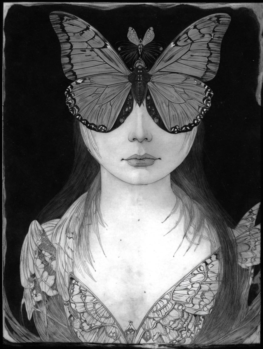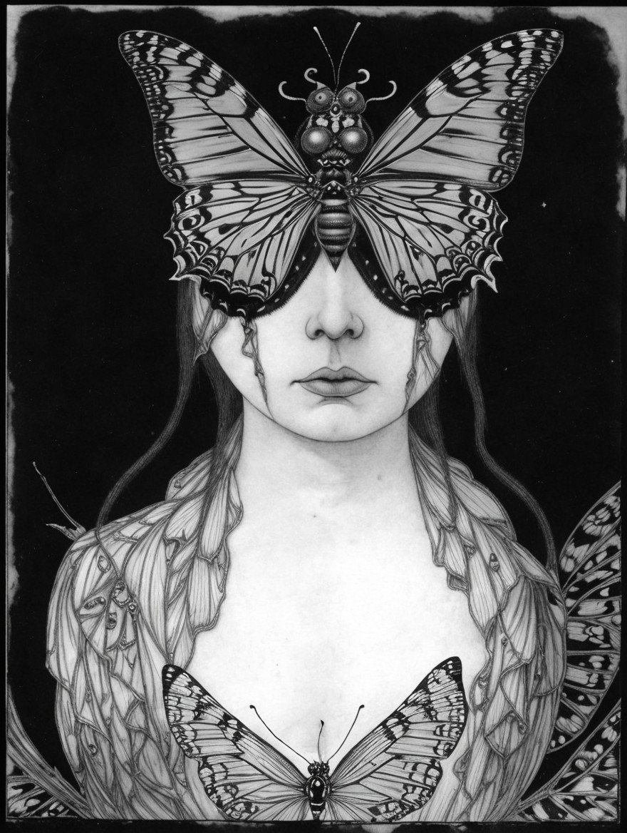 A monochrome illustration of a person with a butterfly mask, surrounded by intricate butterfly wings and floral patterns.