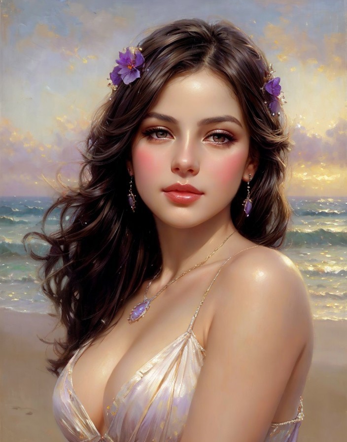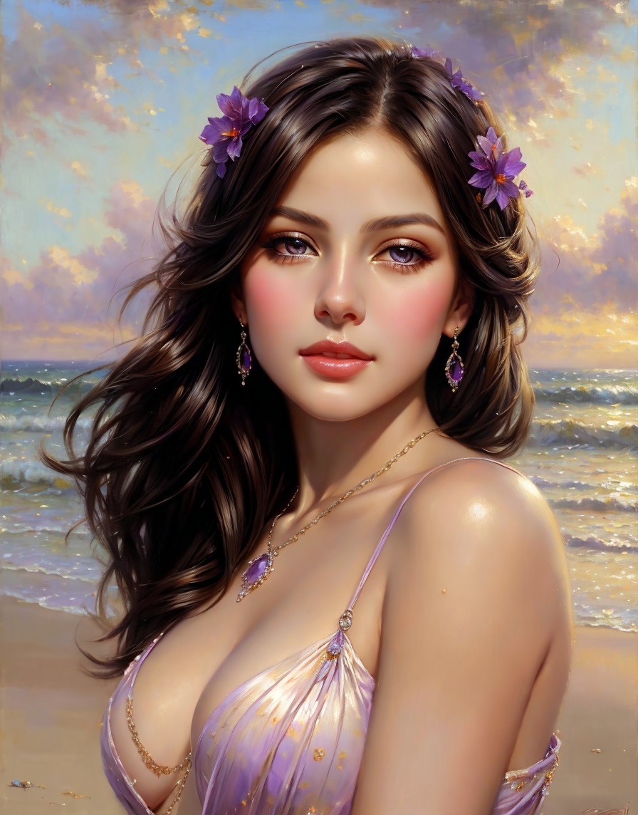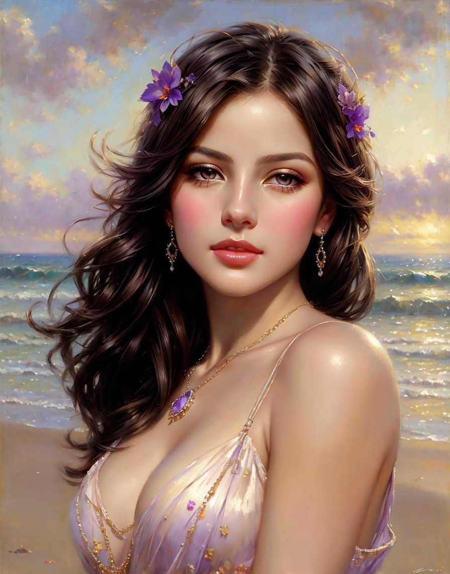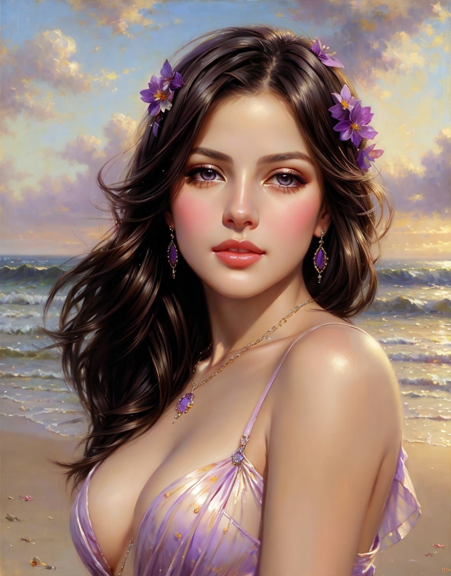 A painting of a woman with dark hair adorned with purple flowers, wearing a lilac dress, with a beach background.