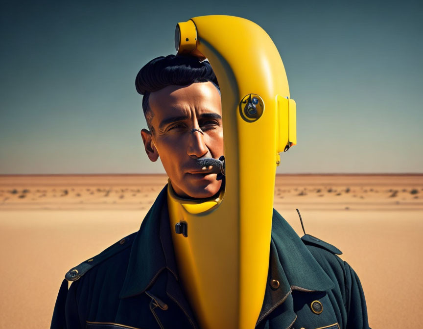 Surrealist portrait: man with head morphed into yellow payphone in desert