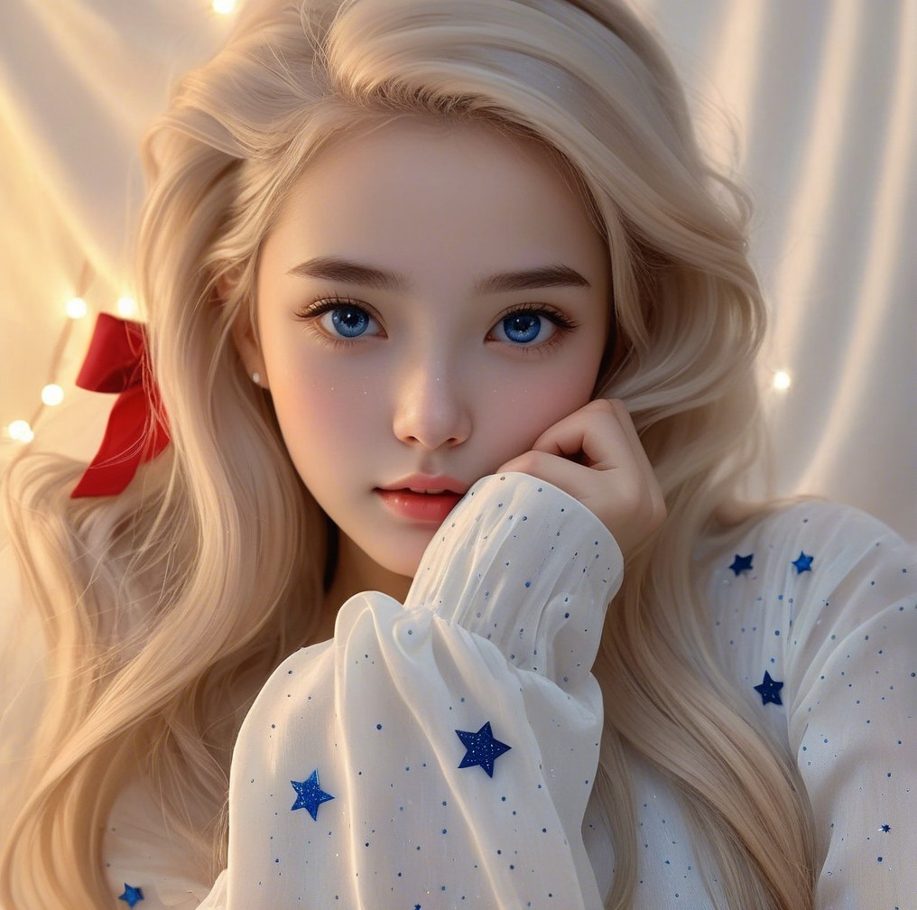 A close-up portrait of a girl with long, wavy blonde hair and striking blue eyes, resting her chin on her hand. She wears a white blouse adorned with blue stars, set against a softly lit background.