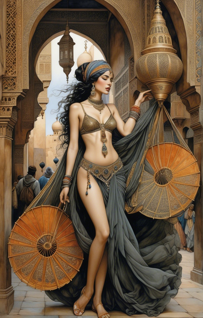 A striking figure adorned in ornate jewelry and flowing fabric stands gracefully, balancing two large, ornate vessels. The backdrop features intricately designed architecture, evoking an atmosphere of elegance.