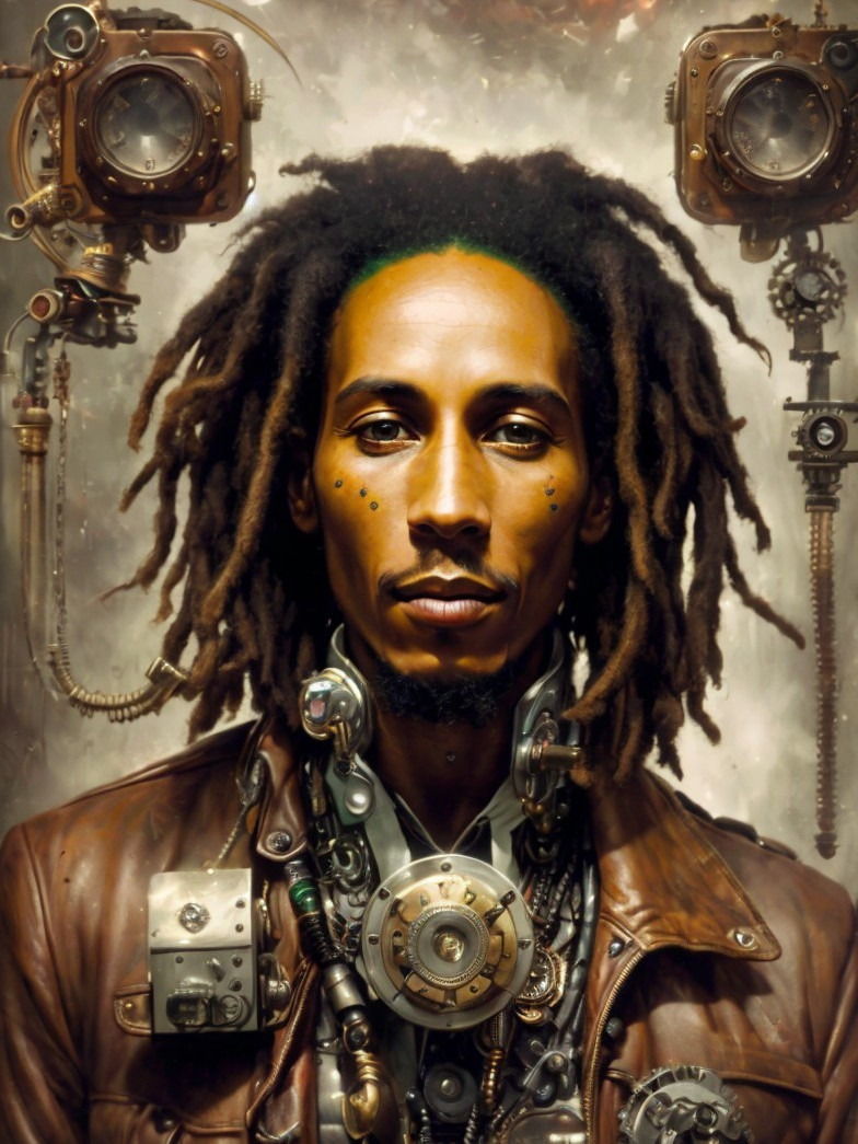 A portrait of a man with dreadlocks, steampunk elements, and a brown jacket against a mechanical background.