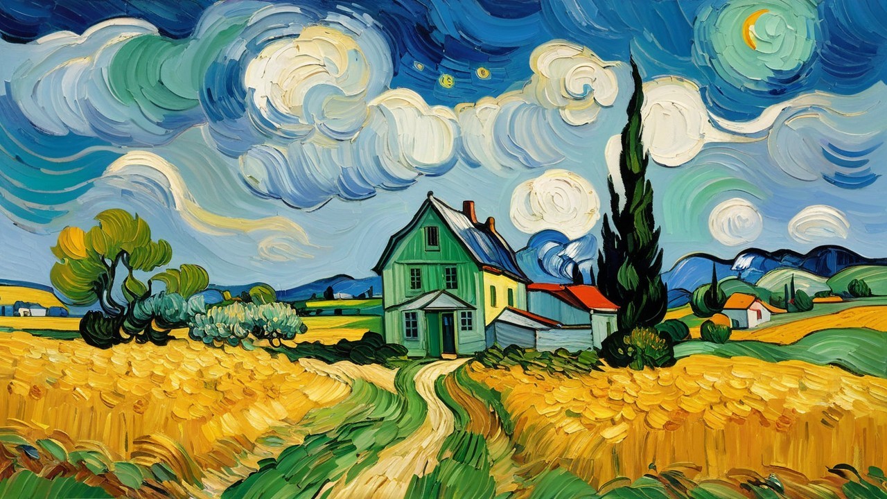 A vibrant impressionistic painting in the style of Van Gogh, depicting a rural landscape under a dramatic blue sky filled with swirling white clouds and a faint crescent moon. The foreground features a vast field of golden wheat, rendered with thick, textured brushstrokes, traversed by a winding dirt path that leads towards a