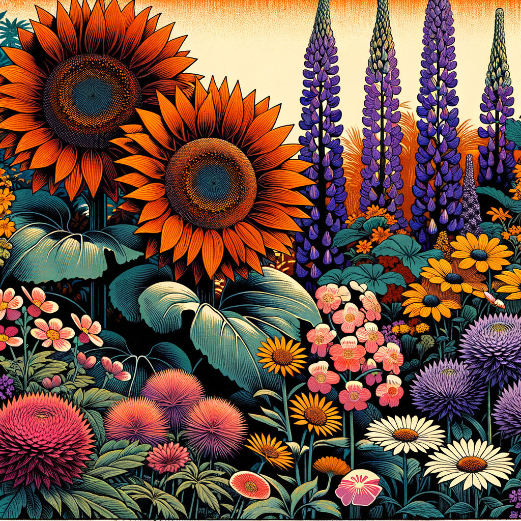 A vibrant illustration of a colorful garden with sunflowers, lupines, and various flowers under a stylized sky.