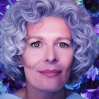 A woman with curly, silver hair wears vibrant pink sunglasses. Her reflection shows colorful floral patterns, blending harmoniously with a psychedelic, colorful background.