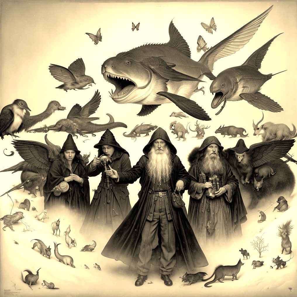 An illustration features wizards surrounded by different animals, real and mythical, in a grayscale, surrealistic composition.