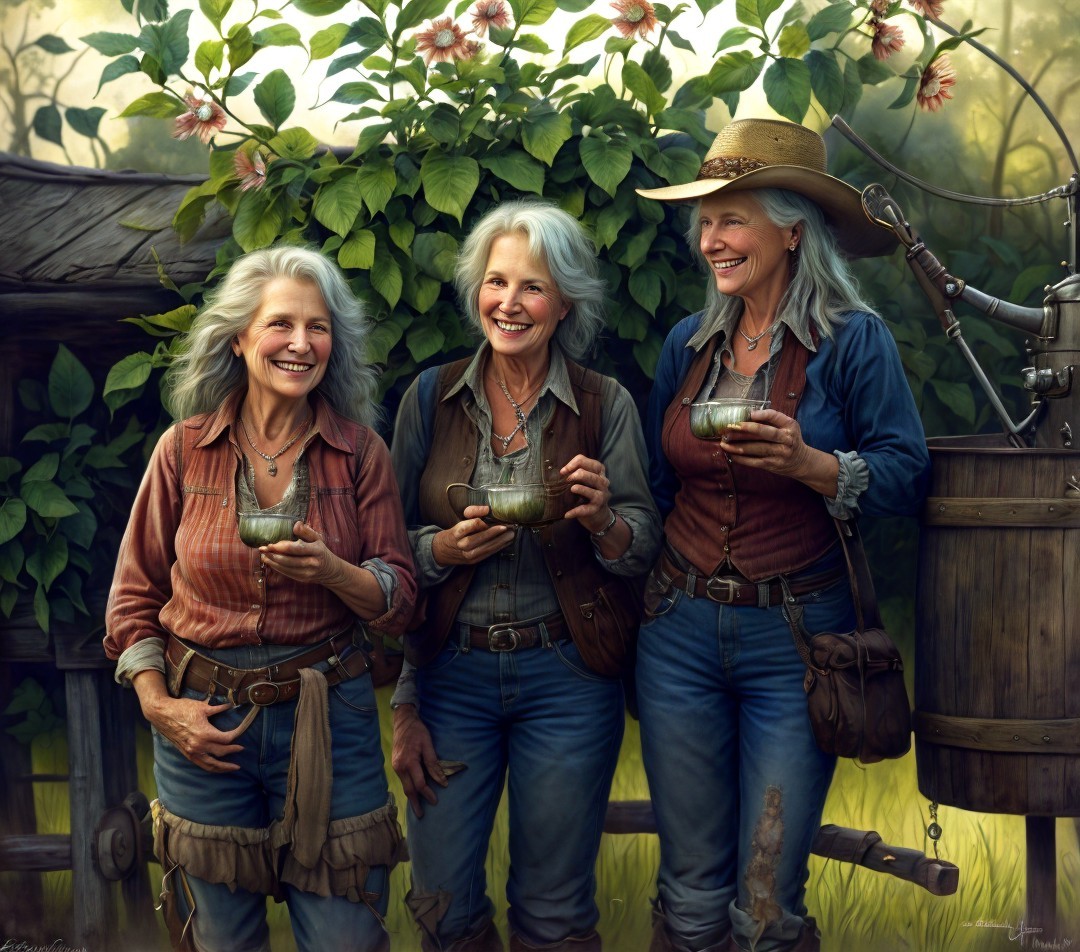 Three elderly women laugh joyfully in a forest, holding drinks, with a still in the background, suggesting they are making moonshine.
