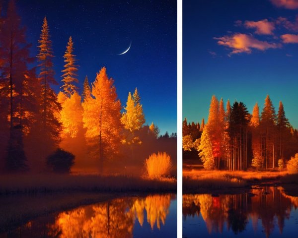 A serene landscape at dawn features a calm pond with blooming water lilies, tall grasses, and gentle fog. The sun rises softly in the background, with dragonflies dancing above the water's surface.