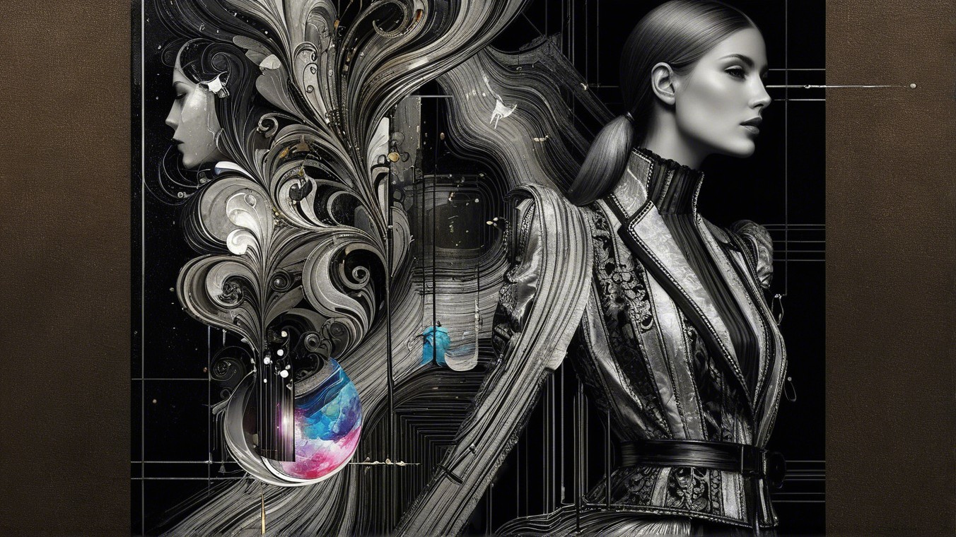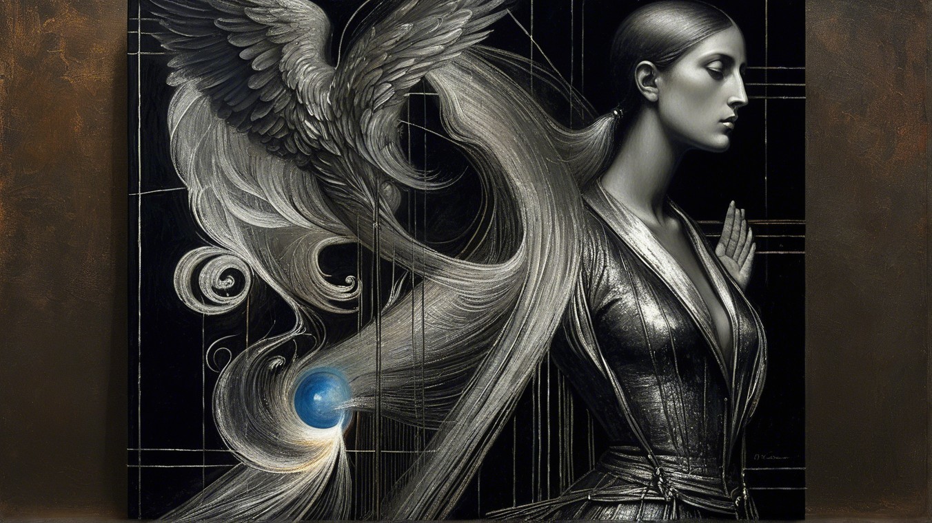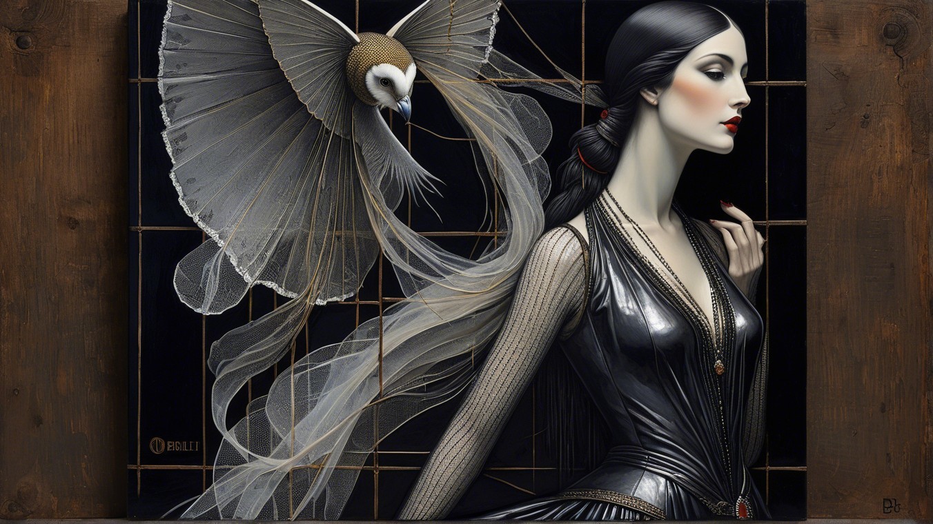 A striking figure of a woman in a sleek, dark dress, adorned with elegant accessories. A majestic bird with golden features gracefully hovers beside her against a backdrop of intricate patterns.